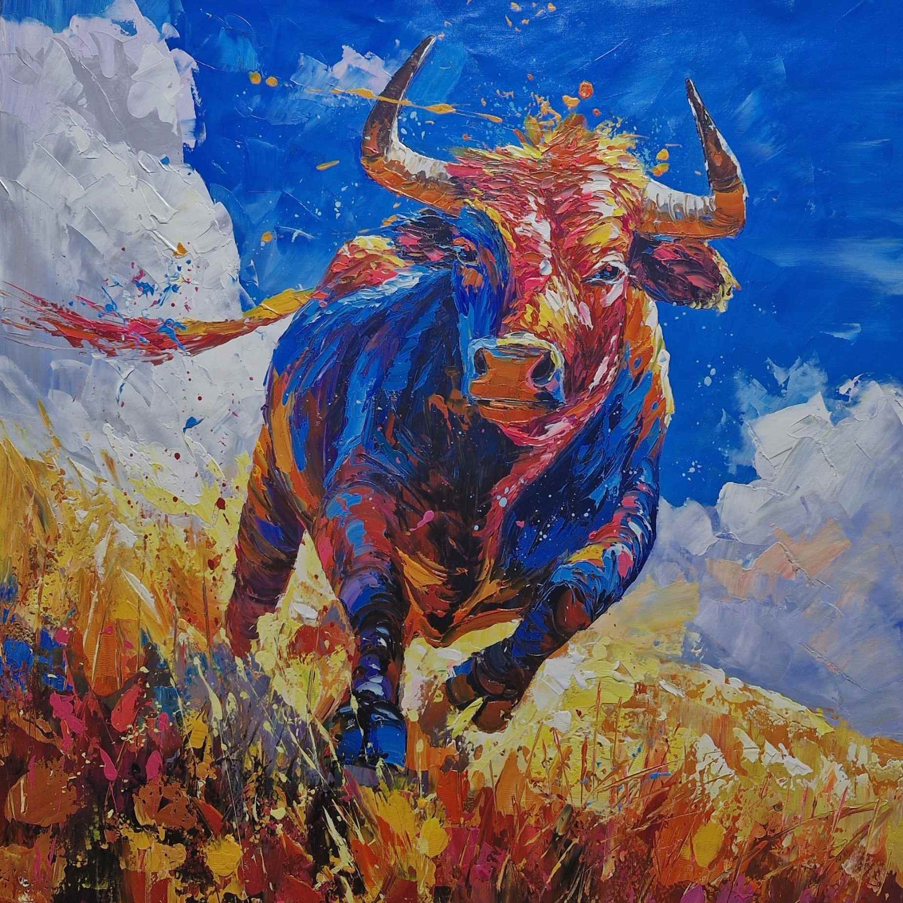 Transform any space with the expressive power of the "Strength in Colors" oil painting , a hand-painted masterpiece that captures the energy and vitality of a bull in motion. This decorative animal art piece combines intense tones and dynamic brushstrokes that convey strength, freedom, and character.