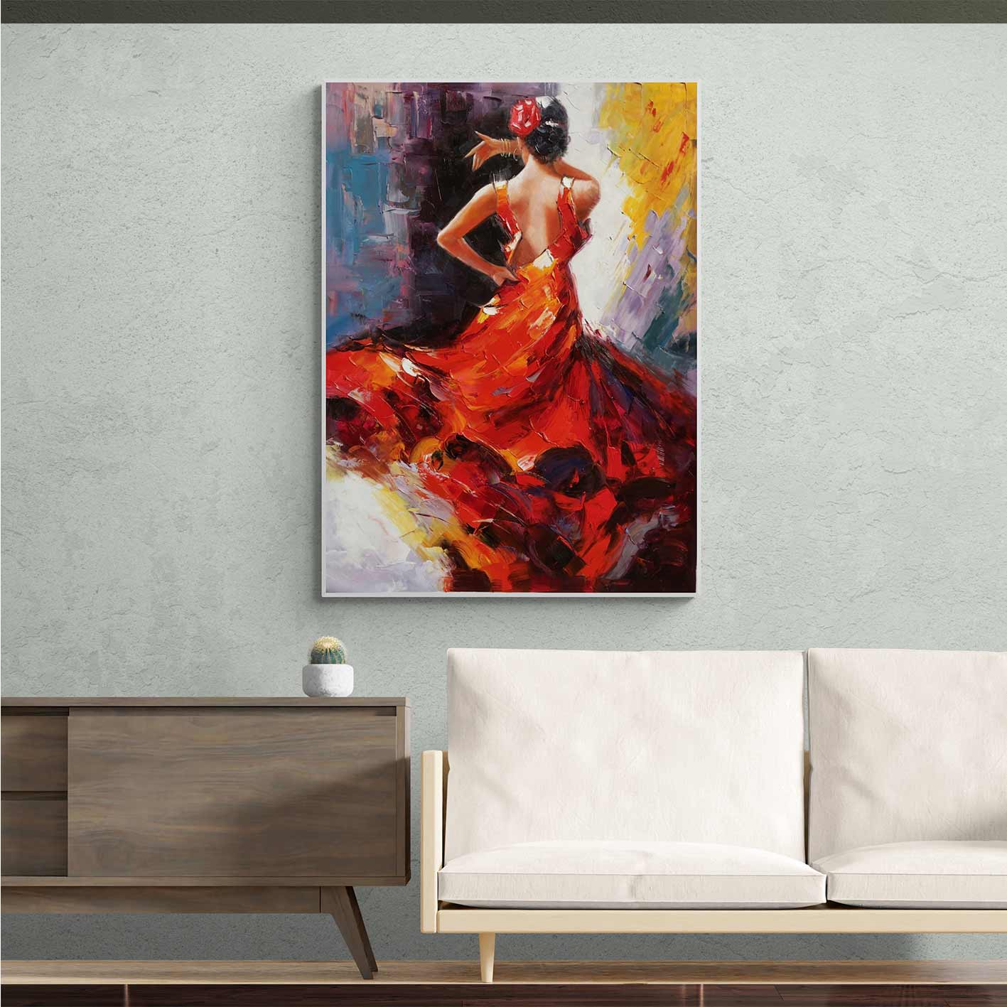 Enjoy the beauty of flamenco dance paintings with this handmade, oil-painted canvas. The elegance of the dancing flamenco dancer contrasts with the intense passion conveyed in every movement. This work of art is a perfect addition to any space seeking a touch of exclusivity and refinement.