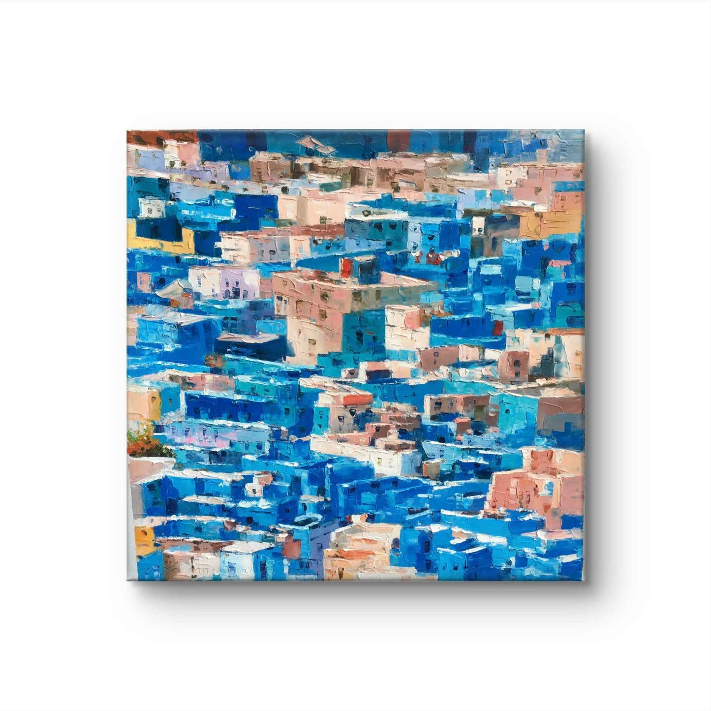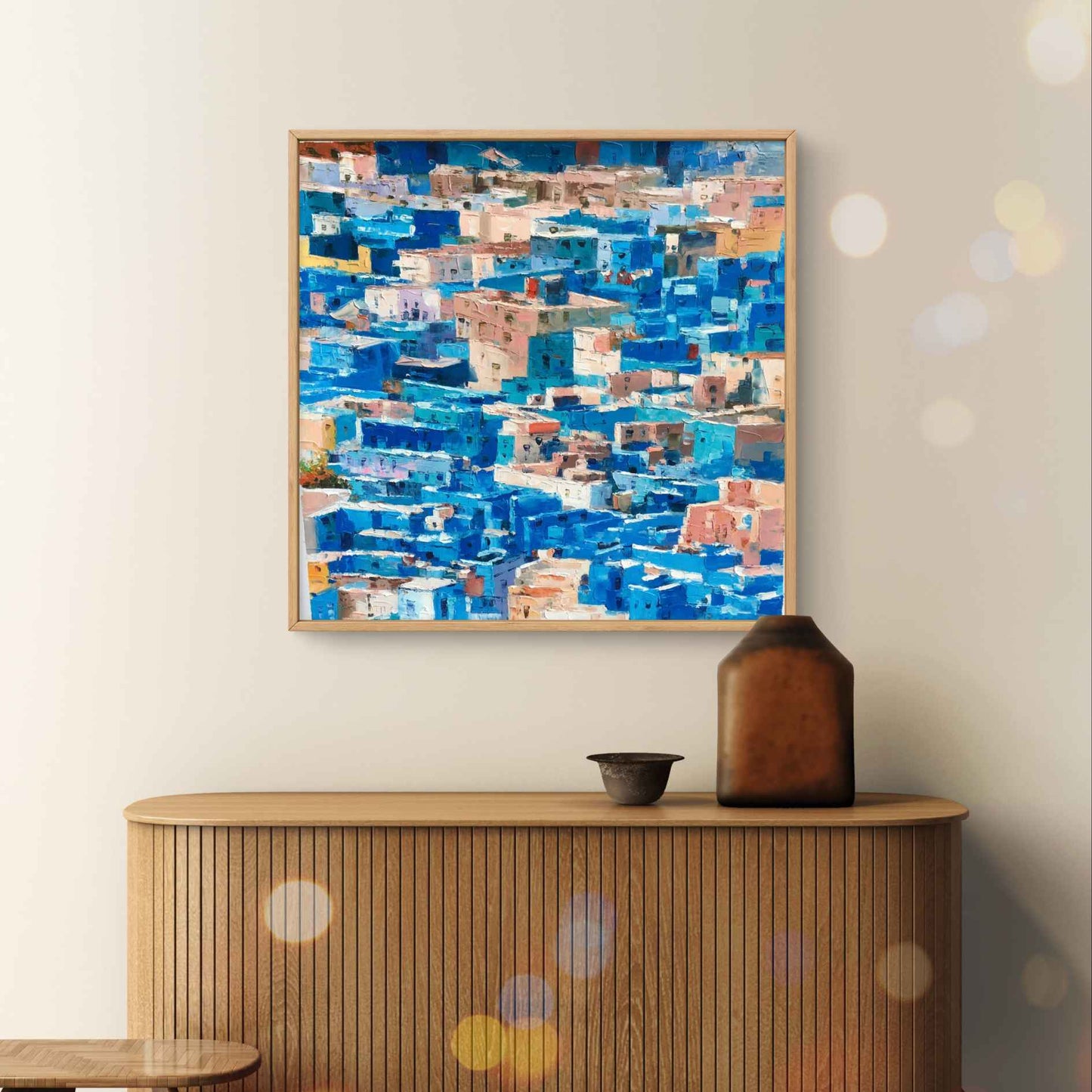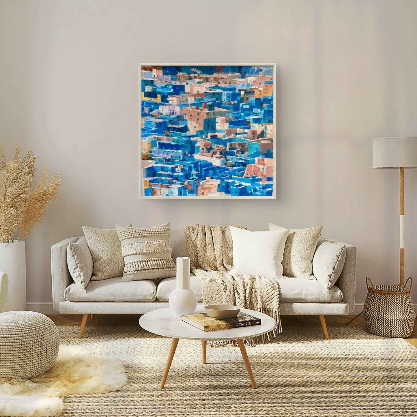 Su formato cuadrado de 103x103 cm impone presencia y equilibrio. Las variaciones de azul, los toques arena y las estructuras geométricas evocan el entramado urbano de Chefchaouen desde una mirada artística. Ideal para quienes buscan arte figurativo urbano con identidad y carácter.