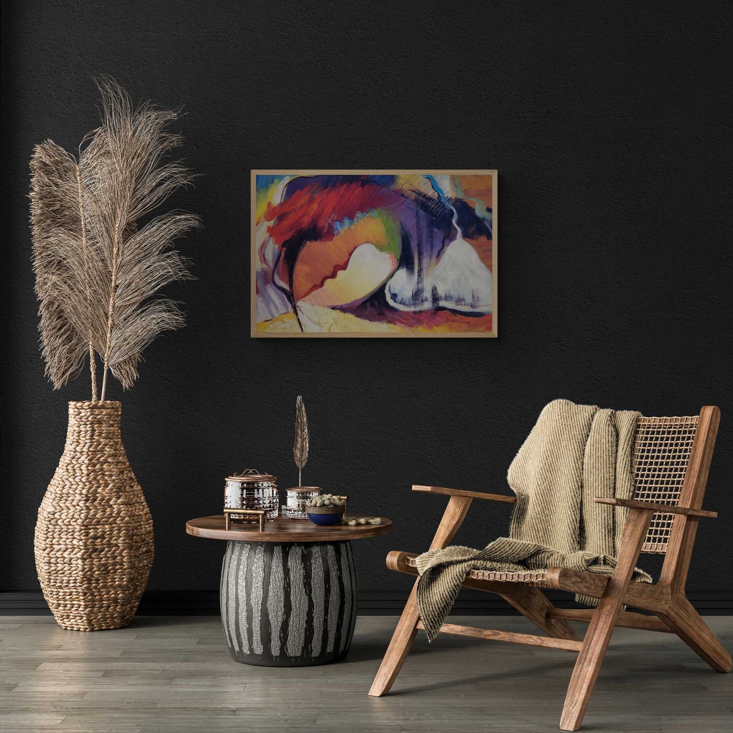 La obra pertenece a nuestra colección de cuadros abstractos coloridos. Sin embargo, mantiene un equilibrio sereno que invita a la contemplación. Por eso encaja en salones modernos, dormitorios elegantes y salas con estilo contemporáneo. Asimismo, armoniza con maderas claras, metal negro y textiles neutros.