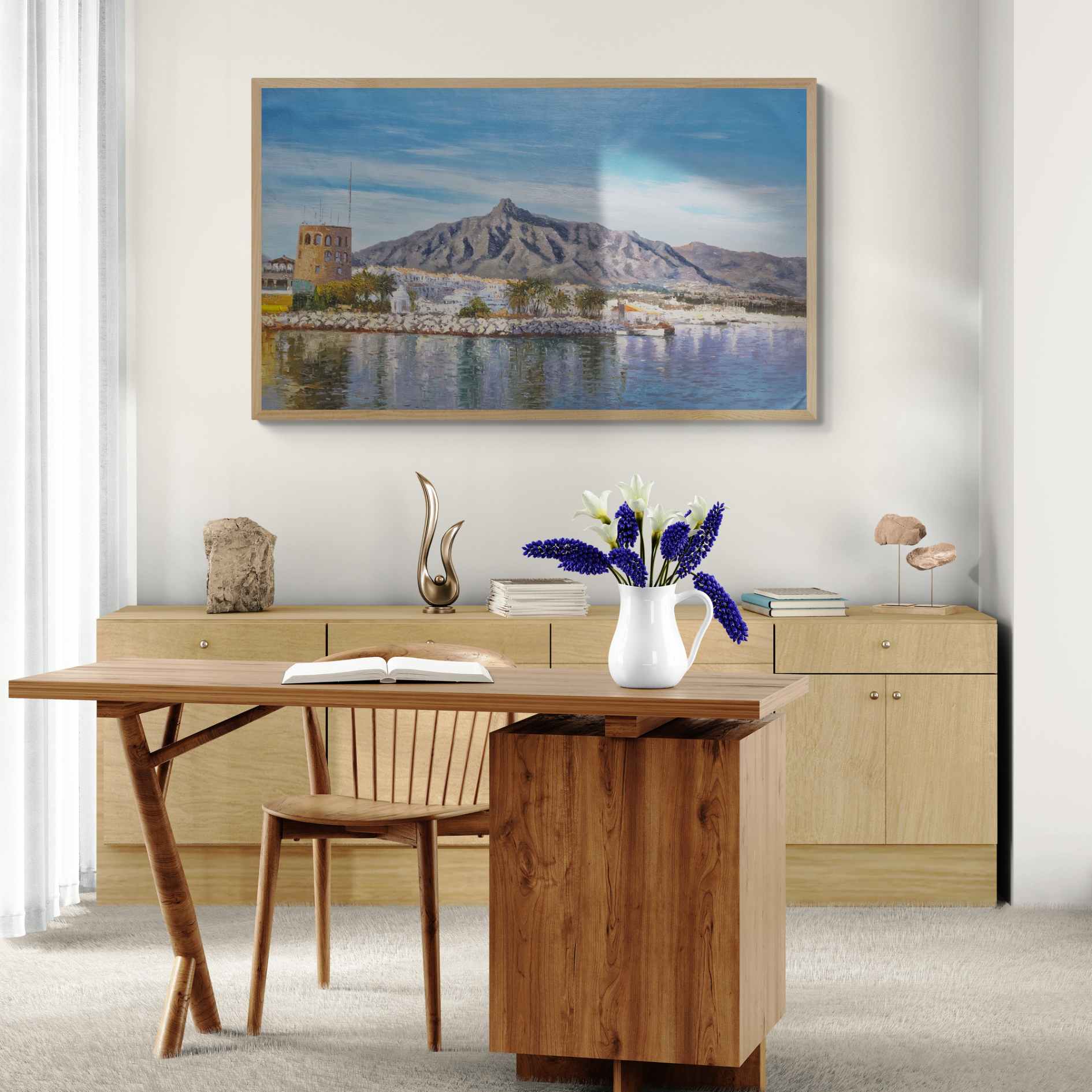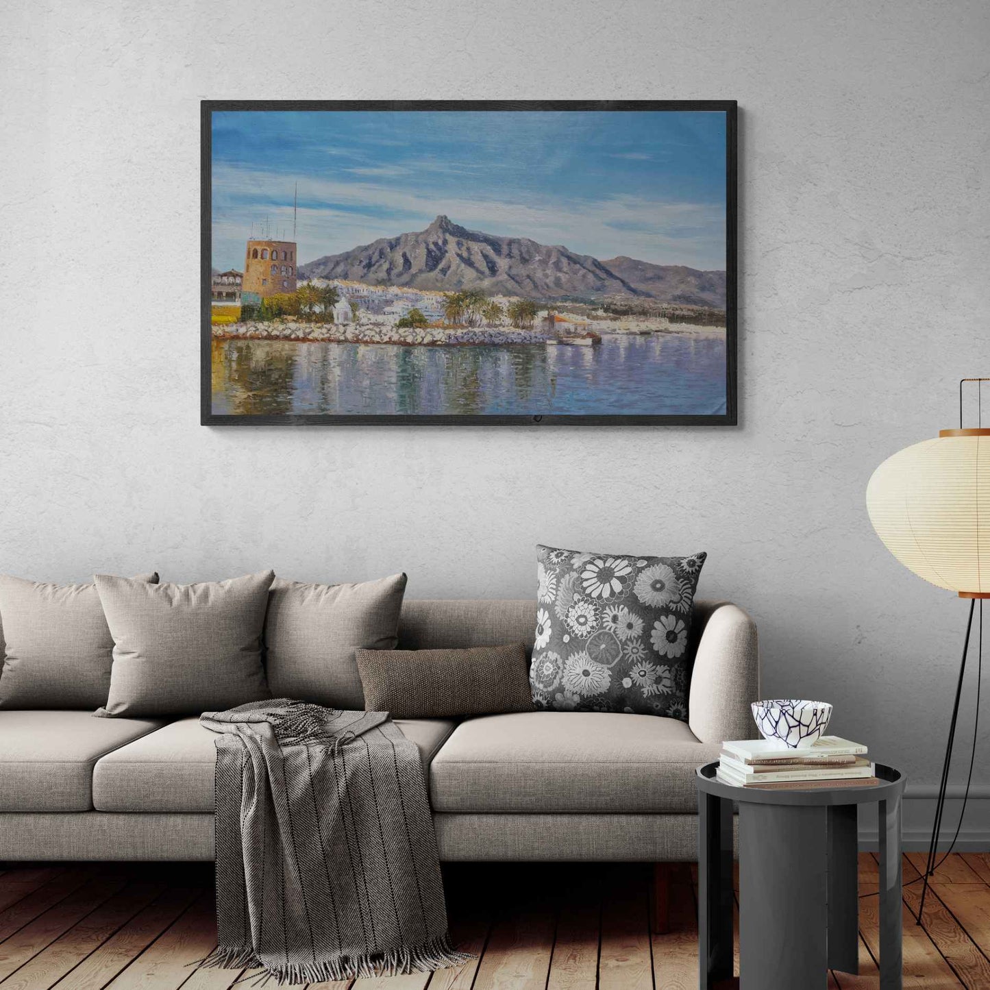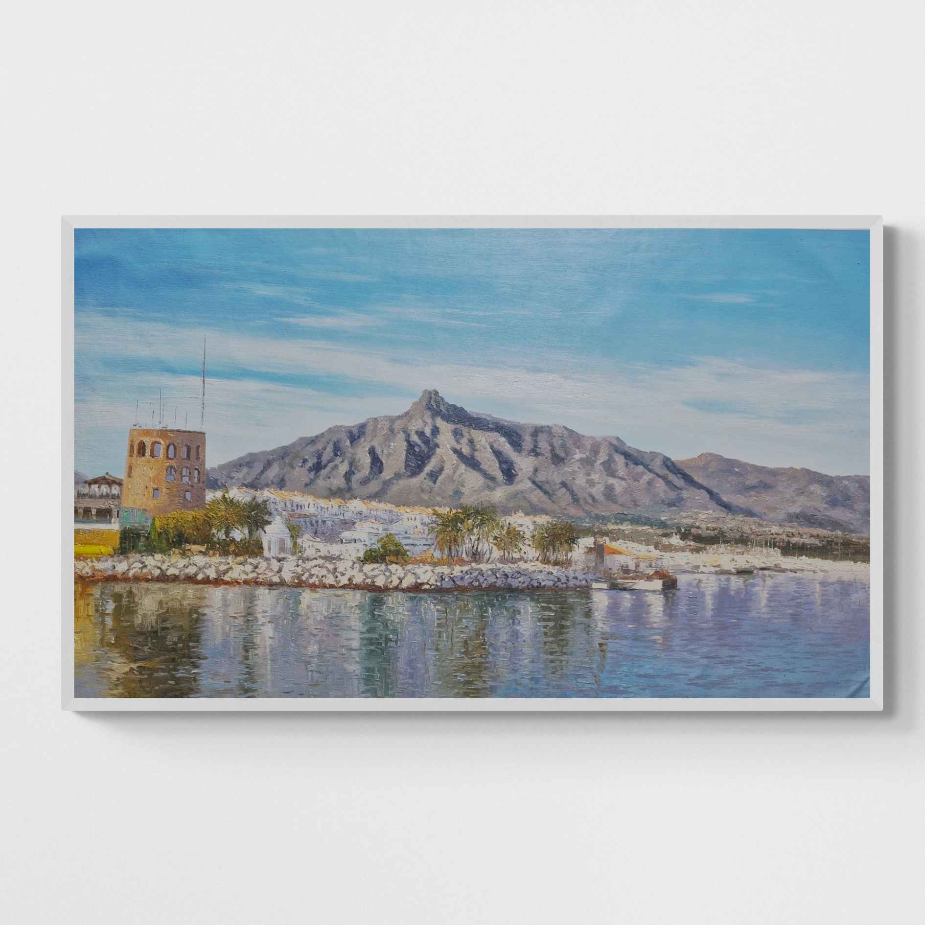 Transforma tu espacio con esta exclusiva pintura al óleo de Puerto Banús, una obra de arte 100% hecha a mano que captura con maestría la icónica silueta de La Concha de Marbella y la serenidad del puerto más lujoso del Mediterráneo.