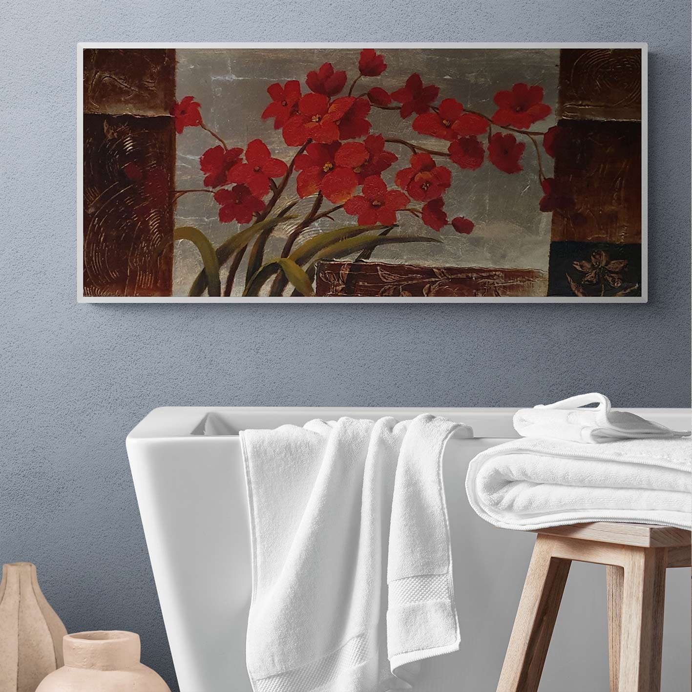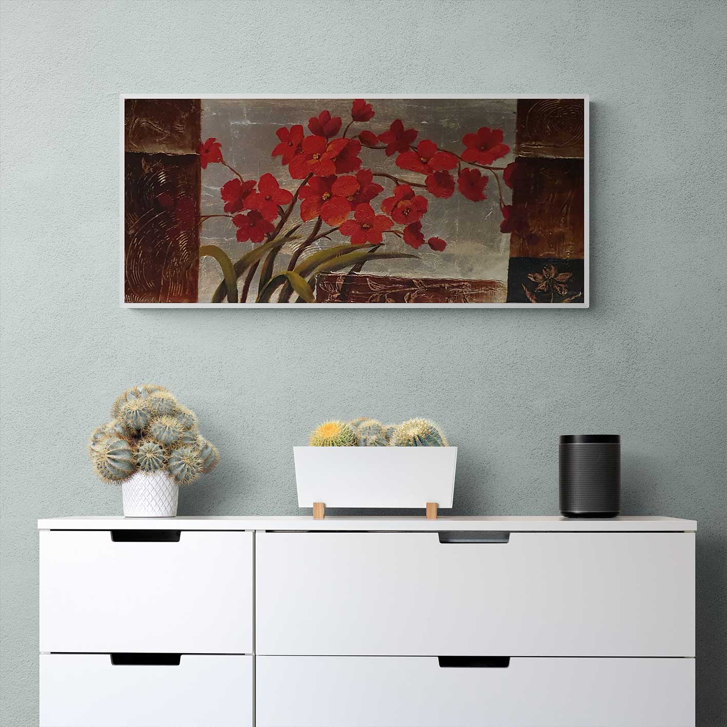 Inspirado en los colores vibrantes y el brillo dorado, el cuadro decorativo "Oros" se encarga de aportar un toque de lujo y elegancia a cualquier espacio. Hecho con pan de oro, el cuadro se distingue por su hoja de oro y fondo rojo que ofrecen una pieza  extravagante para todos aquellos que buscan marcar un estilo con su decoración.