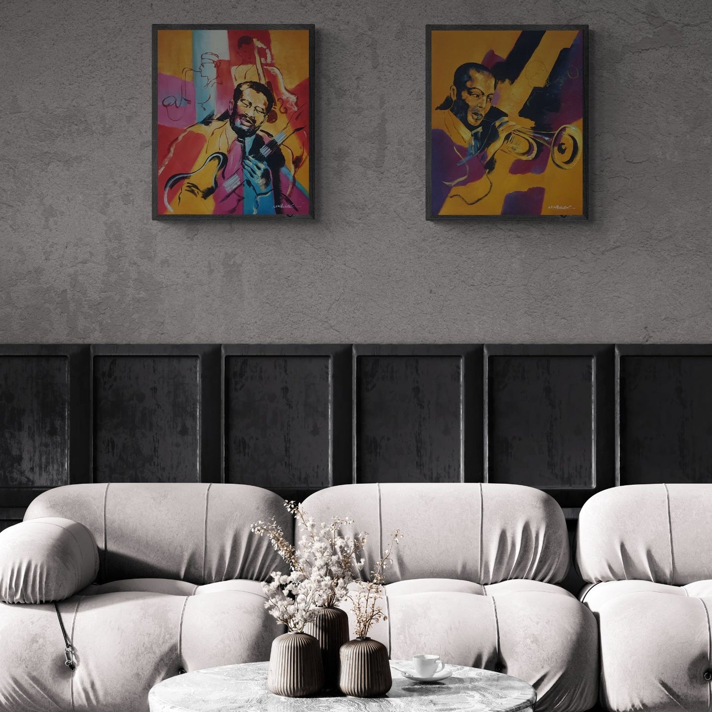 Dos cuadros pintados al óleo, Arte Pop de dos Músicos uno con la tropeta y otro con la guitarra. Pintura al óleo sobre lienzo, lista para colgar. también puedes añadir un marco de diferentes colores por un poco más.