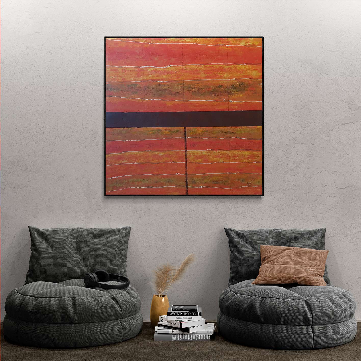 Una obra artística exquisita y moderna con una fuerte presencia visual con tonos naranjas brillantes y líneas armoniosas. Sumérjase en los colores y la geometría que crean un toque de sofisticación a su hogar.
