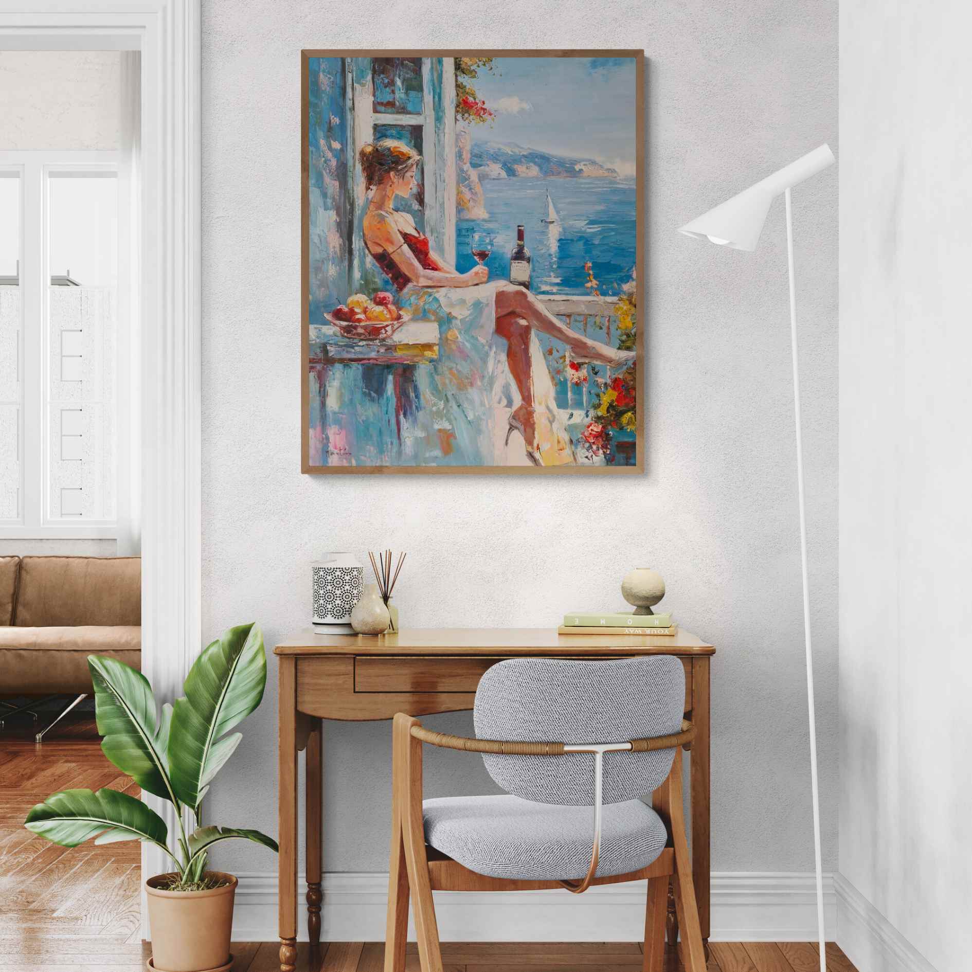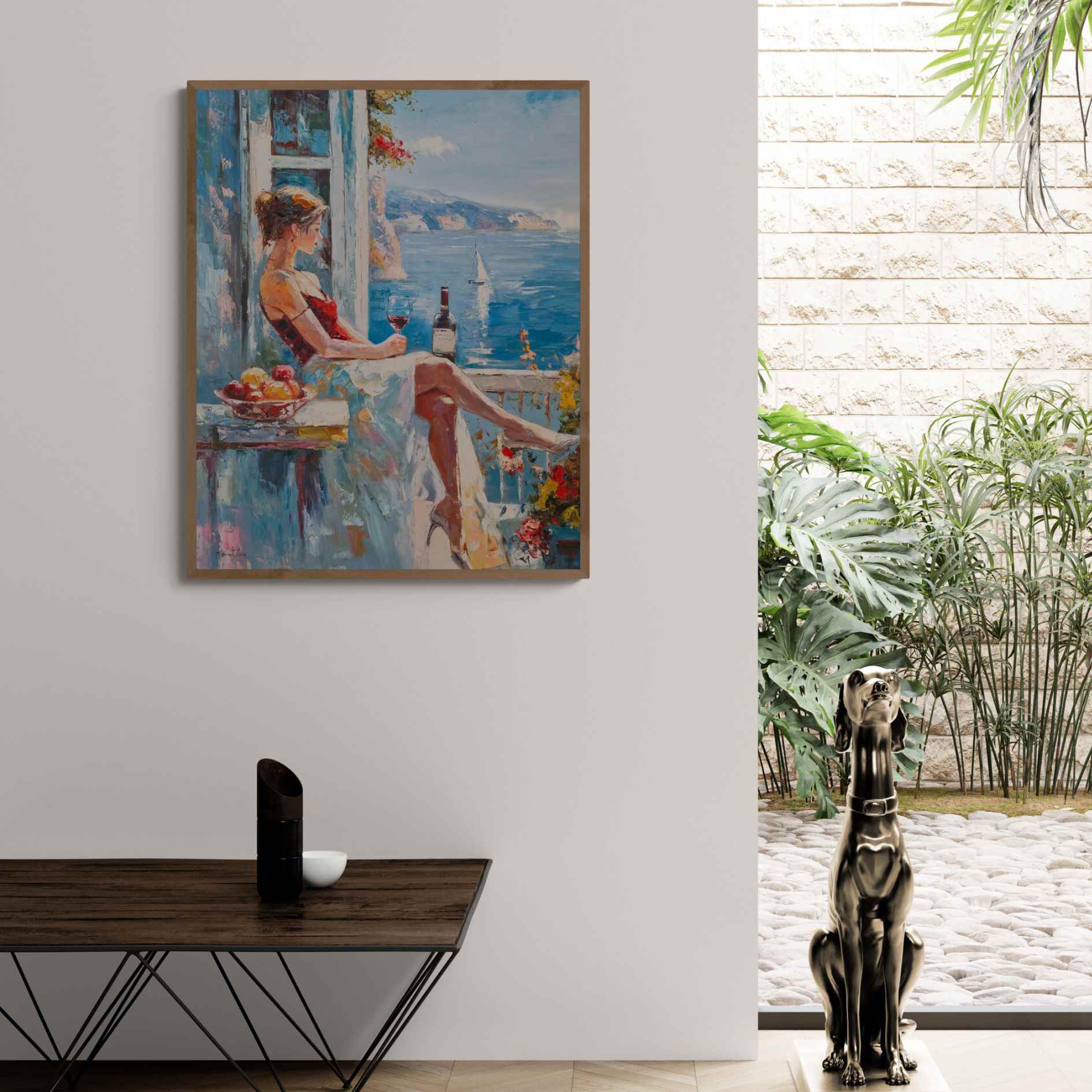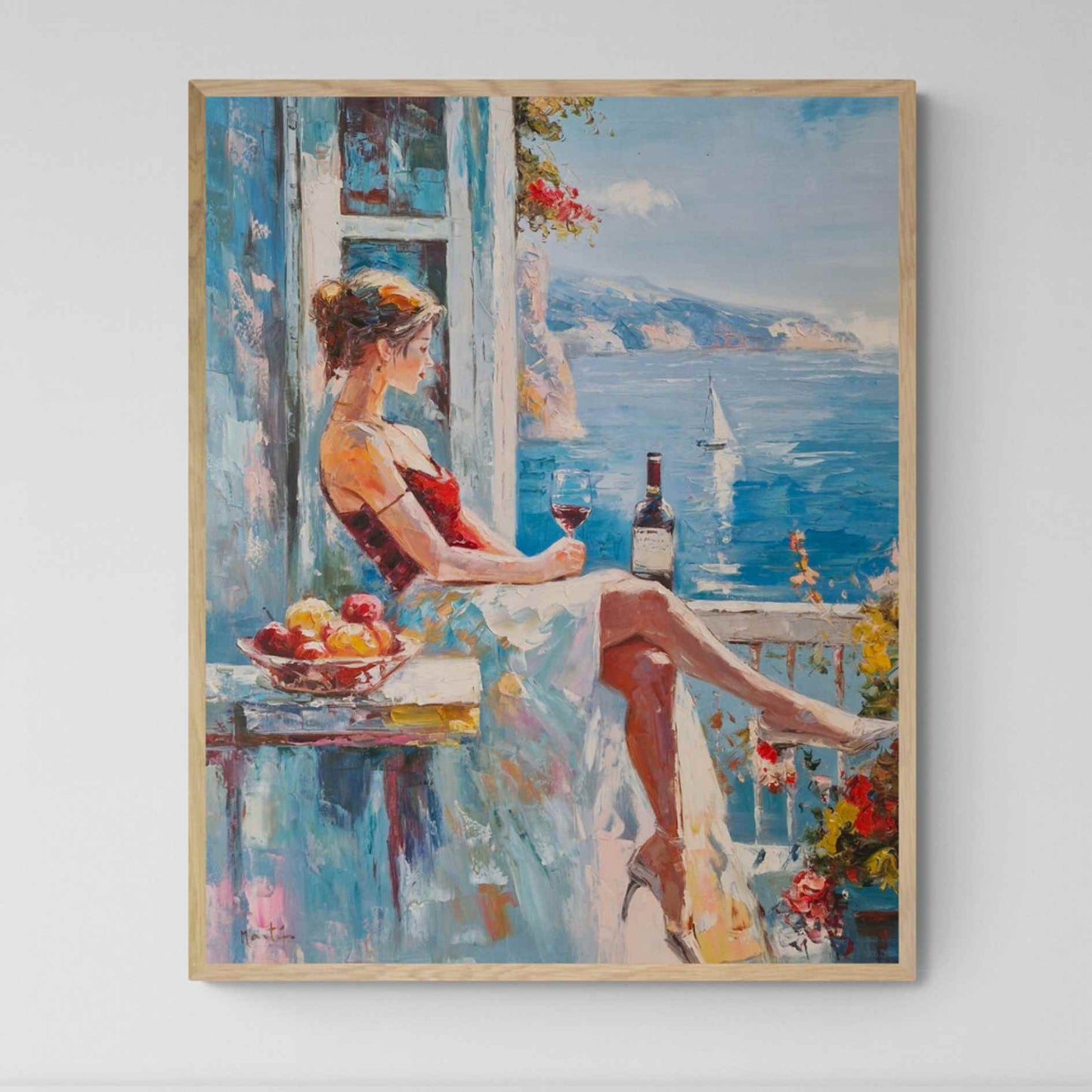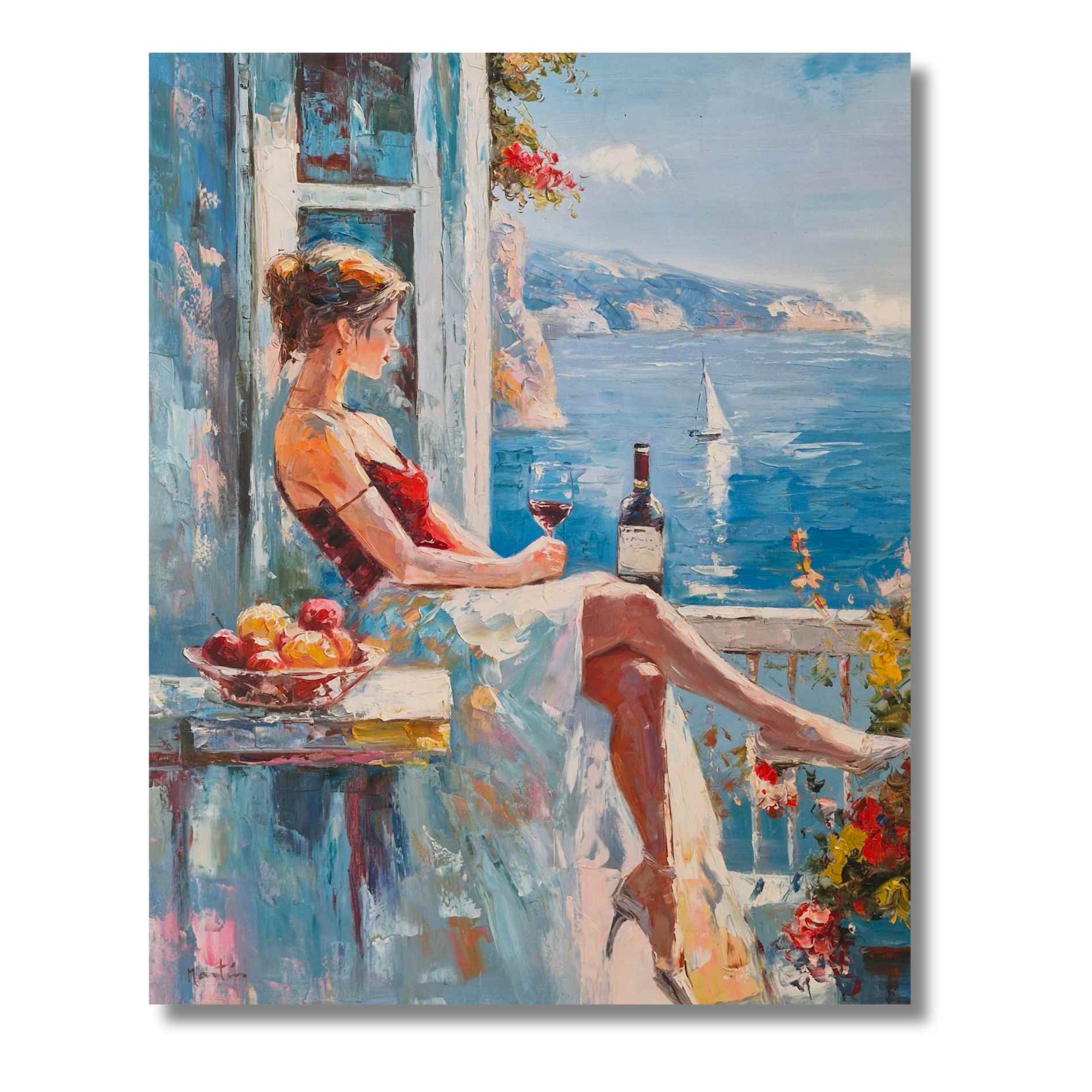 El cuadro presenta una escena romántica y bohemia, ideal para quienes valoran el arte expresivo y las emociones sutiles. La mujer, sentada con elegancia en un balcón abierto al mar, sostiene una copa de vino mientras el viento acaricia su vestido. A su lado, una botella y un cuenco de frutas realzan la composición con detalles llenos de vida.