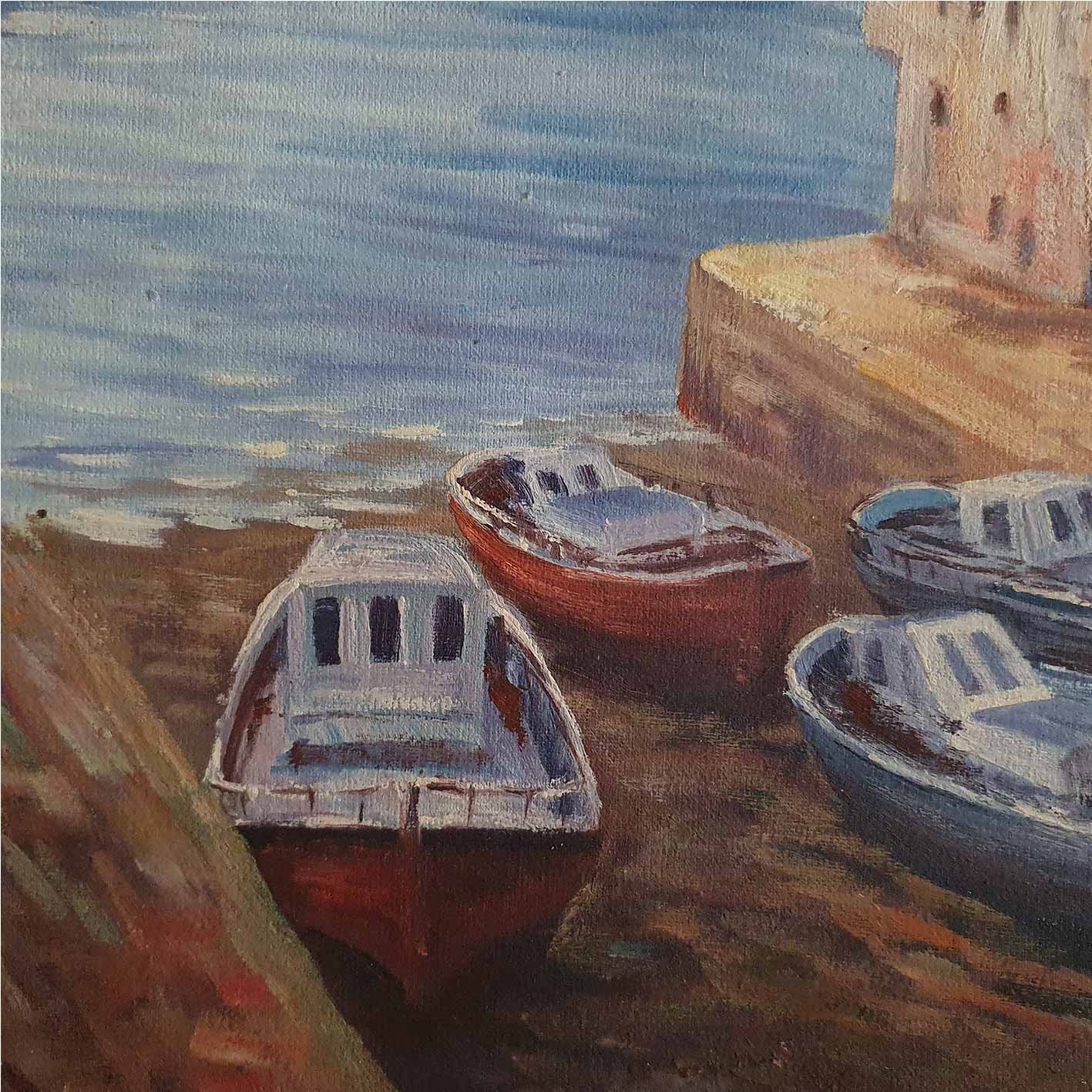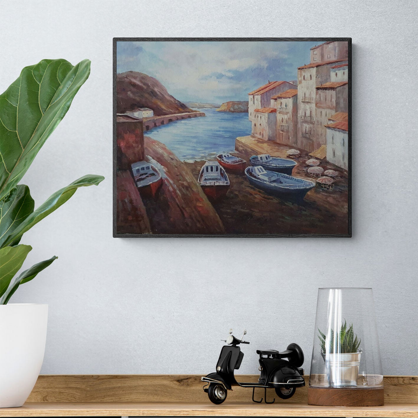 El lienzo de algodón de alta calidad aporta una textura delicada y realza cada detalle del óleo, ofreciendo una pieza única para embellecer cualquier espacio con un toque de encanto mediterráneo.