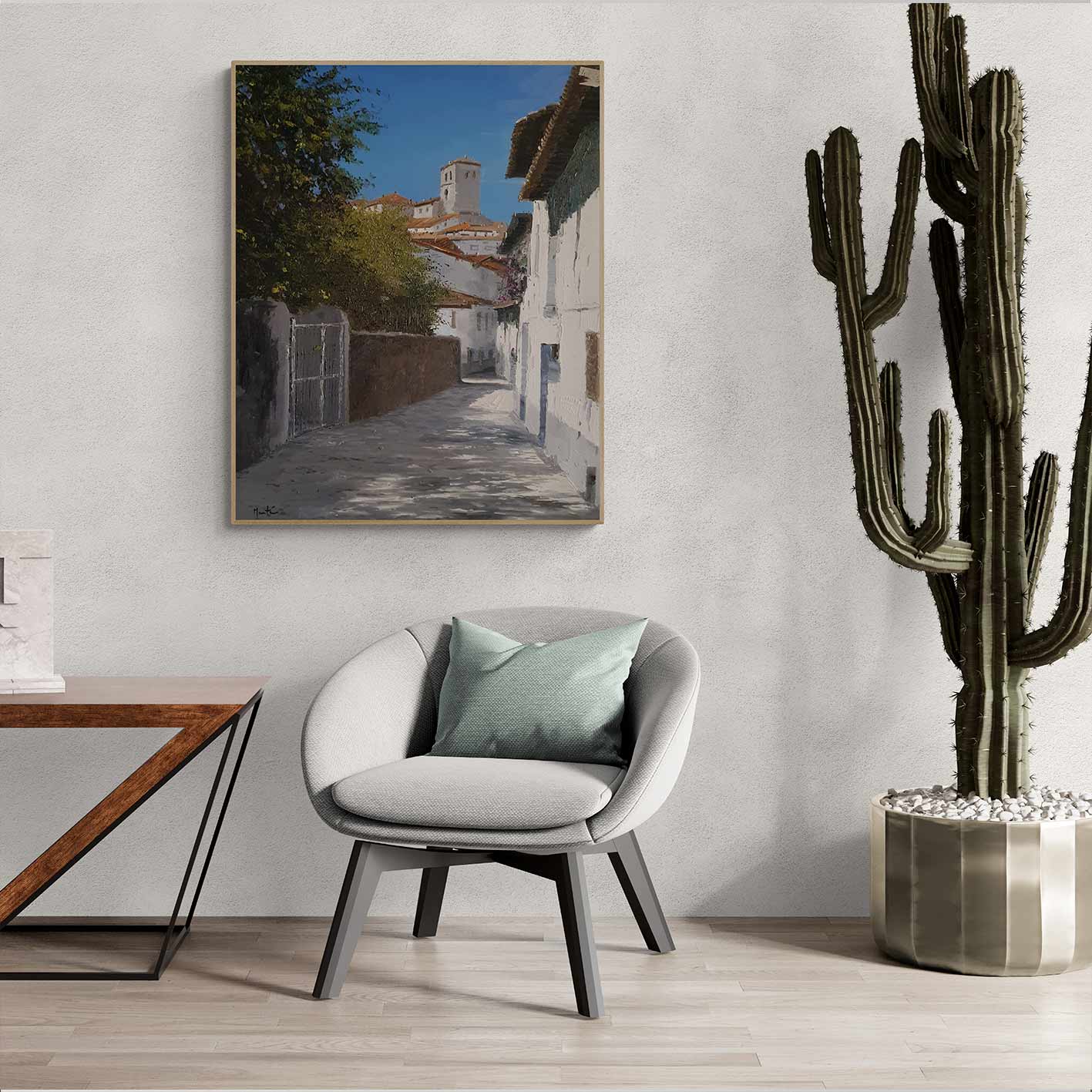 Vas a comprar una pintura al óleo realizada por uno de nuestros artistas y en la mayoría de los casos solamente tenemos una pieza. Disponemos de un servicio de fotomontaje para que puedas ver como queda este cuadro en tu hogar y también que color de marco te gusta más.