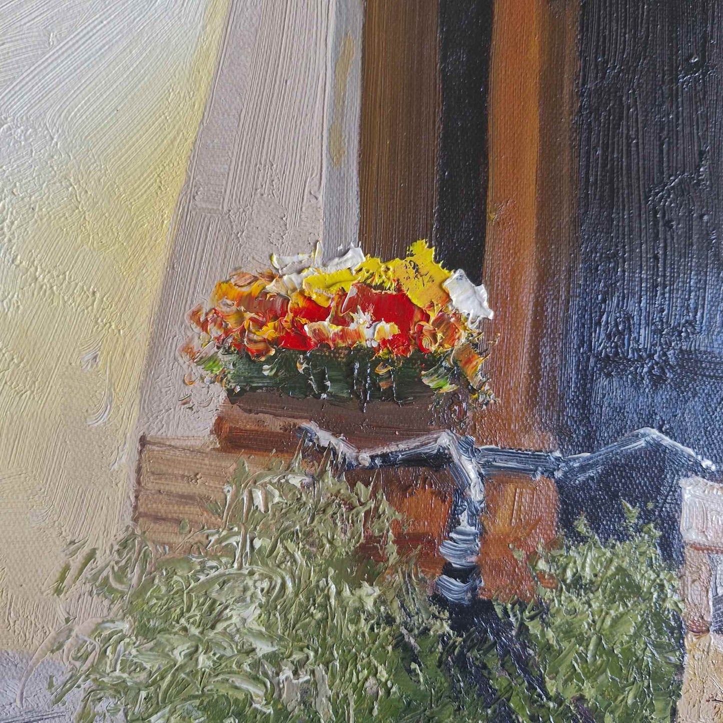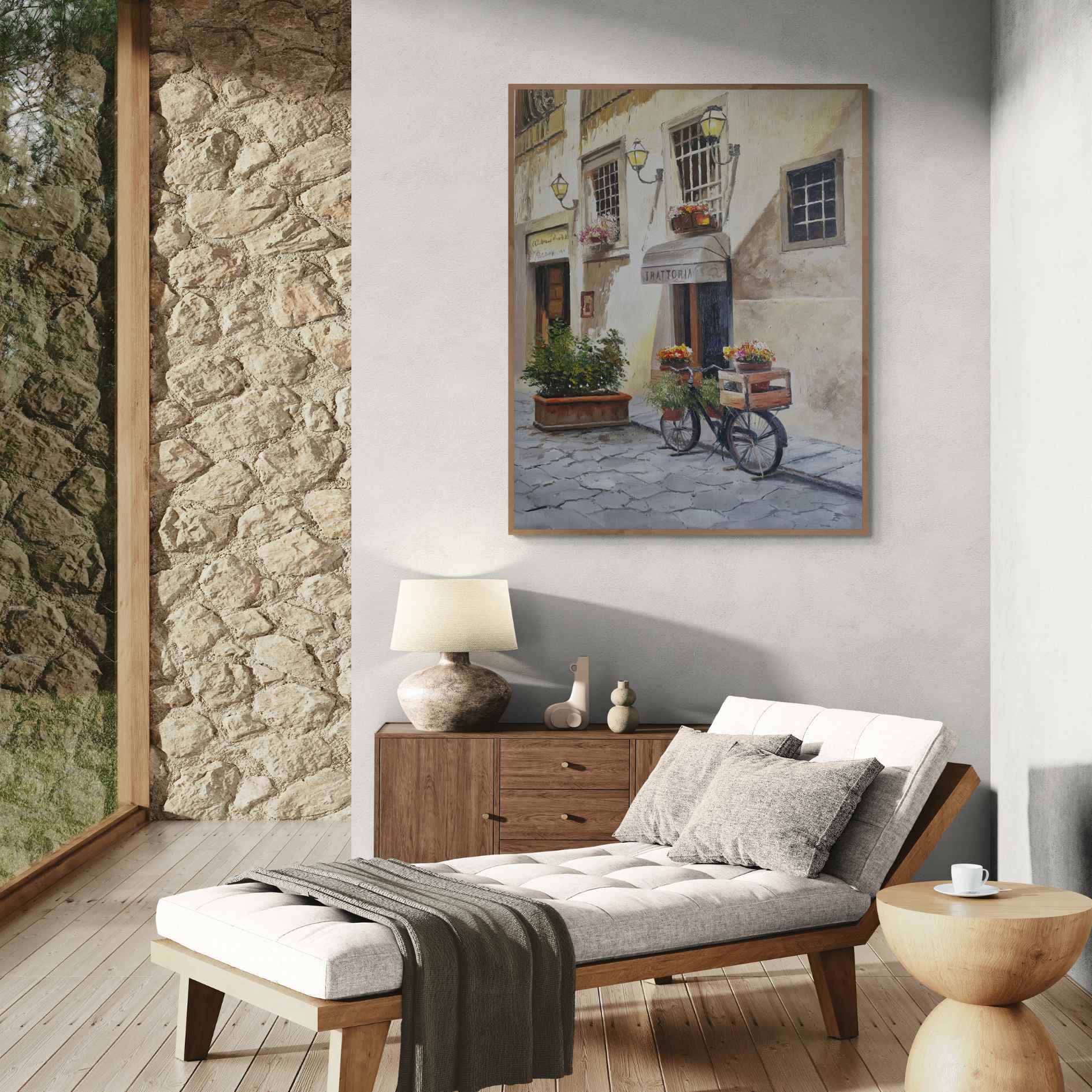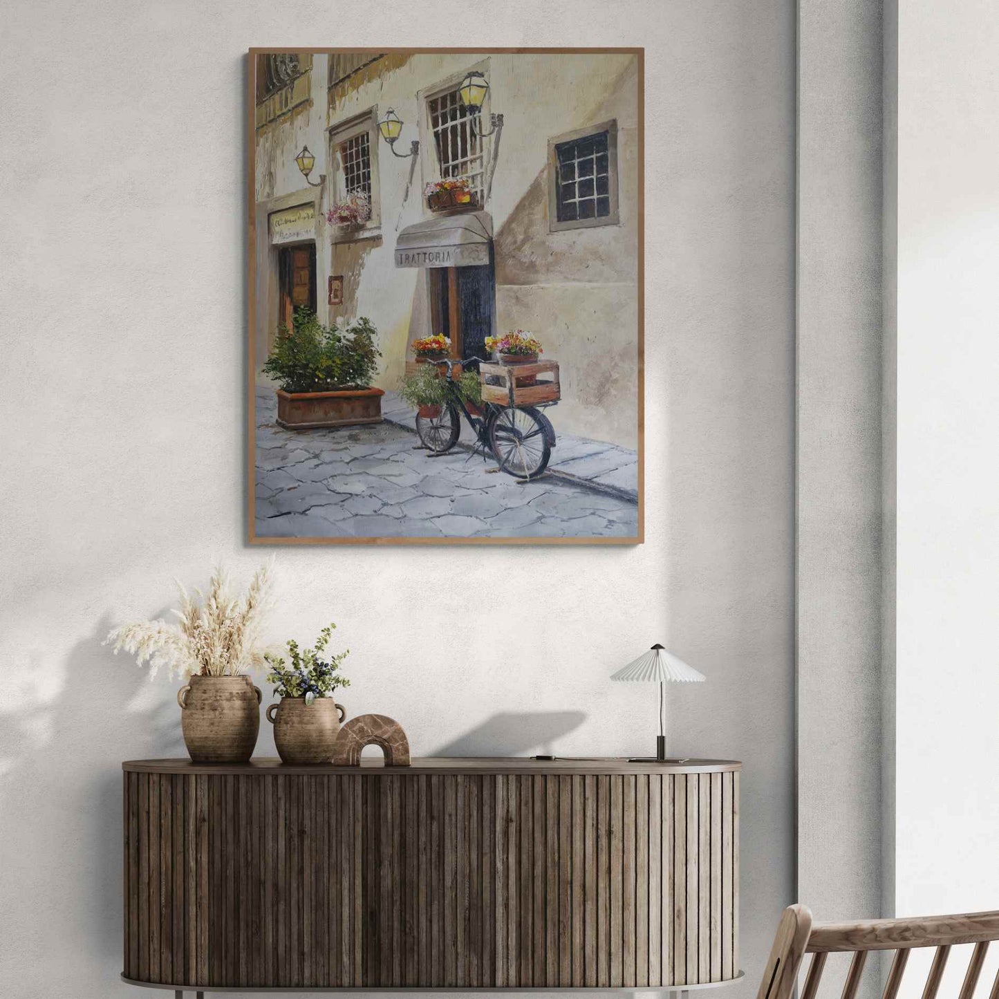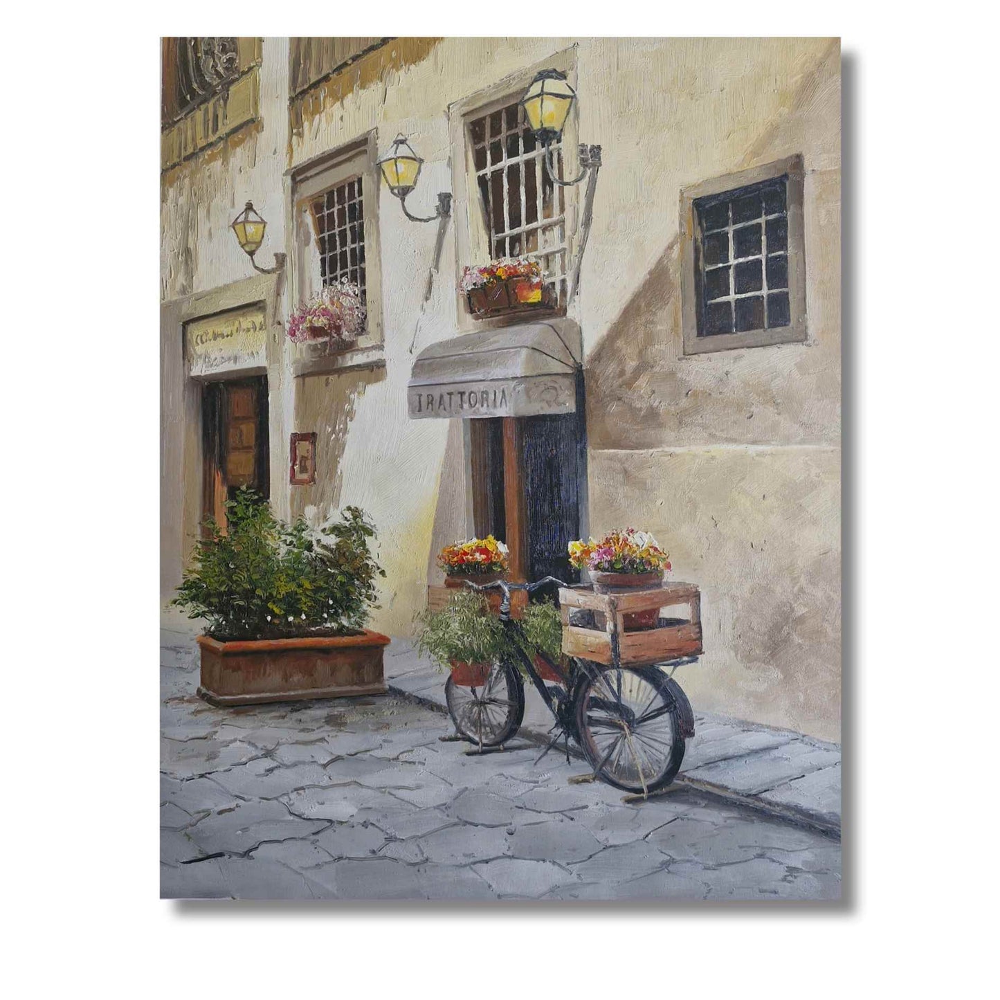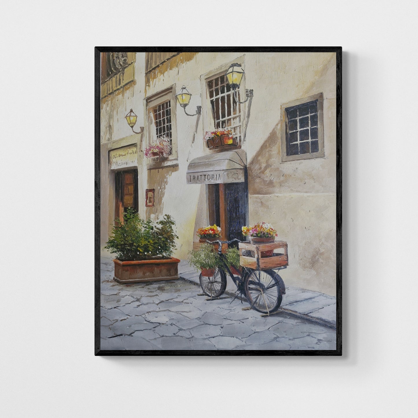 Sumérgete en la atmósfera encantadora de Italia con esta pintura al óleo hecha a mano que retrata una trattoria clásica con bicicleta y flores, en una calle empedrada llena de carácter. Esta obra captura la esencia de la vida mediterránea, evocando calidez, nostalgia y tranquilidad.