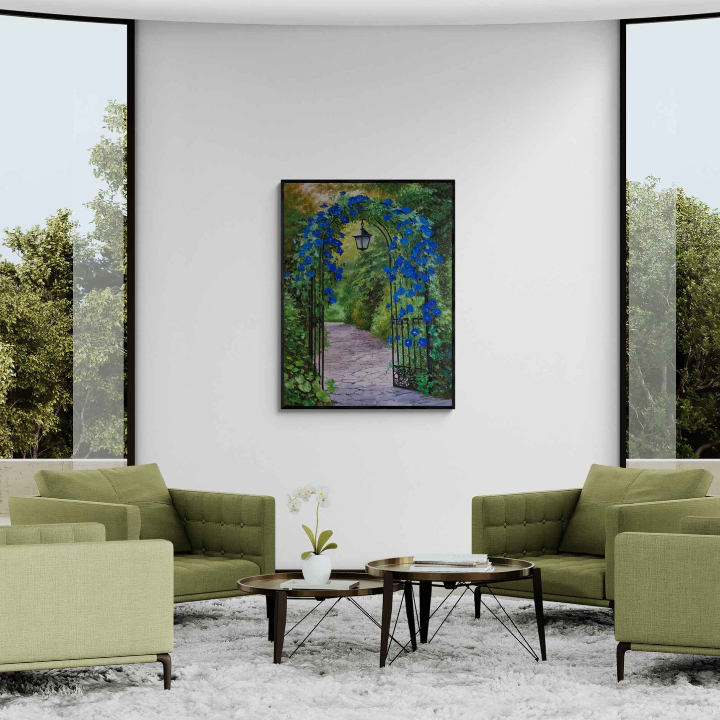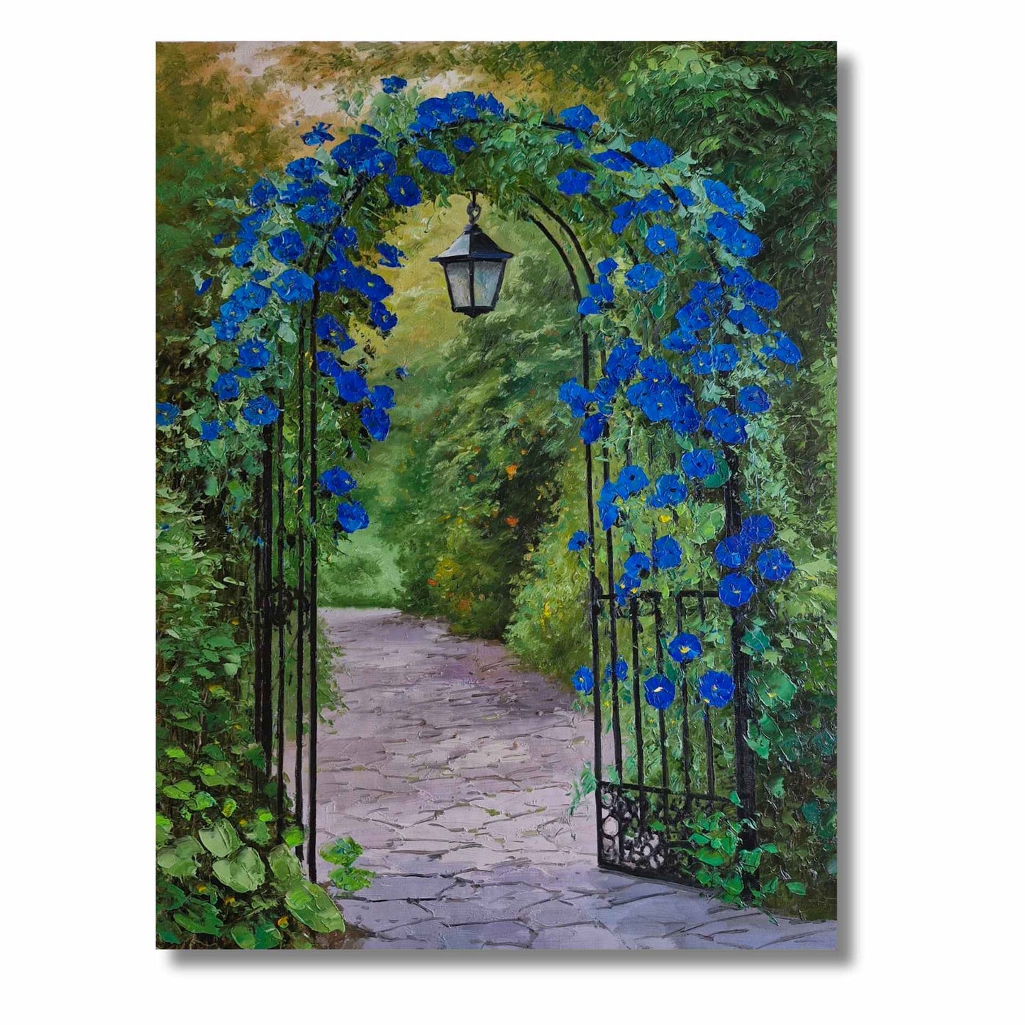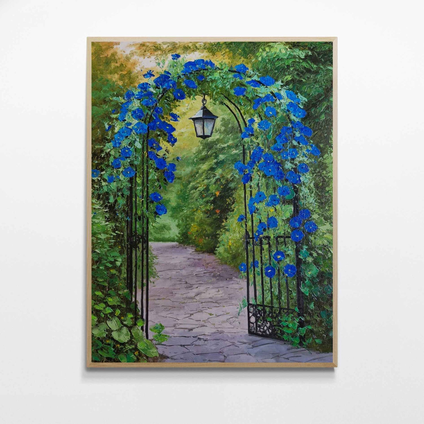 Déjate envolver por la serenidad de un jardín encantado con “Arco Floral Azul”, una obra de arte original, pintada completamente a mano, que captura la belleza de un paseo natural bajo un arco cubierto de flores vibrantes. Esta pintura al óleo, llena de color y profundidad, transmite armonía, frescura y un estilo romántico que cautiva al instante.
