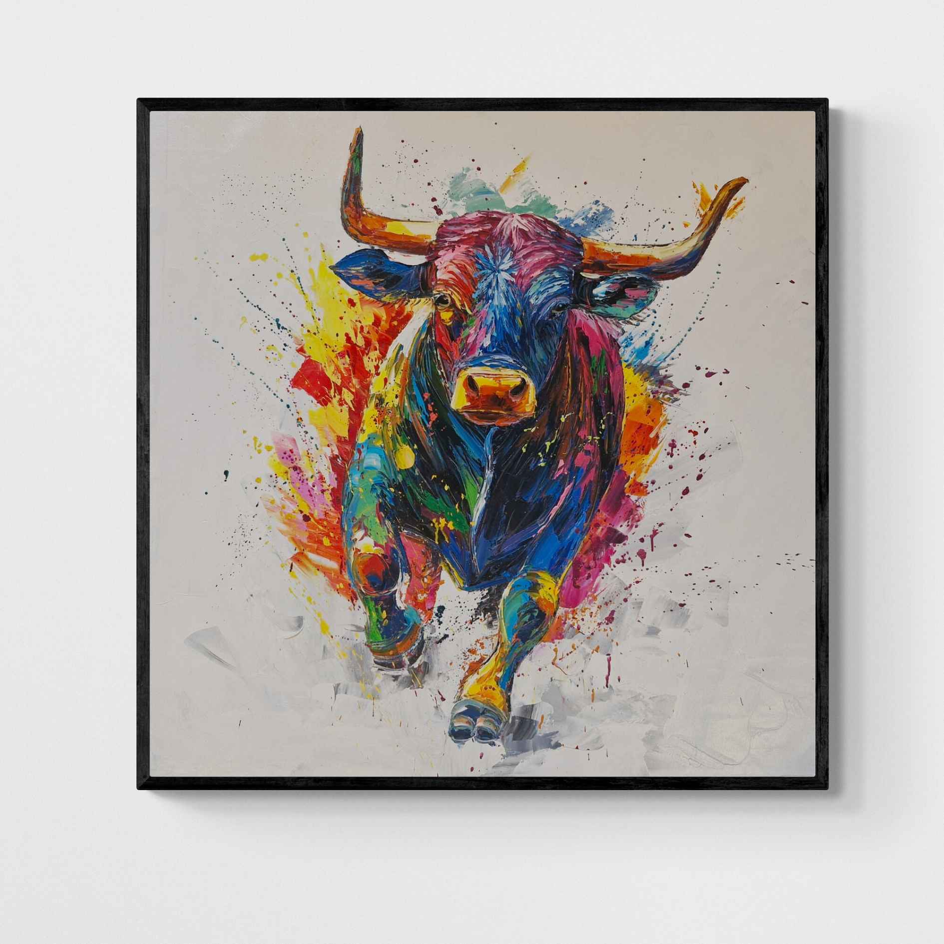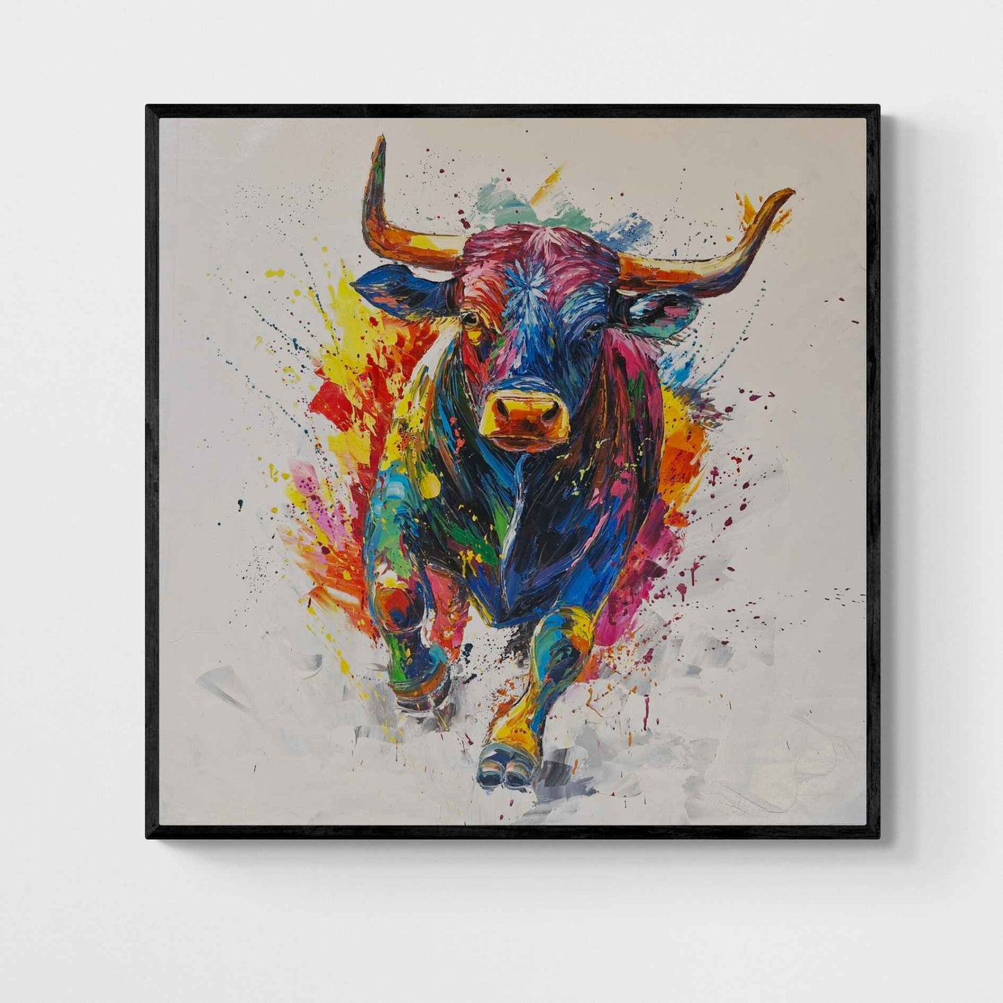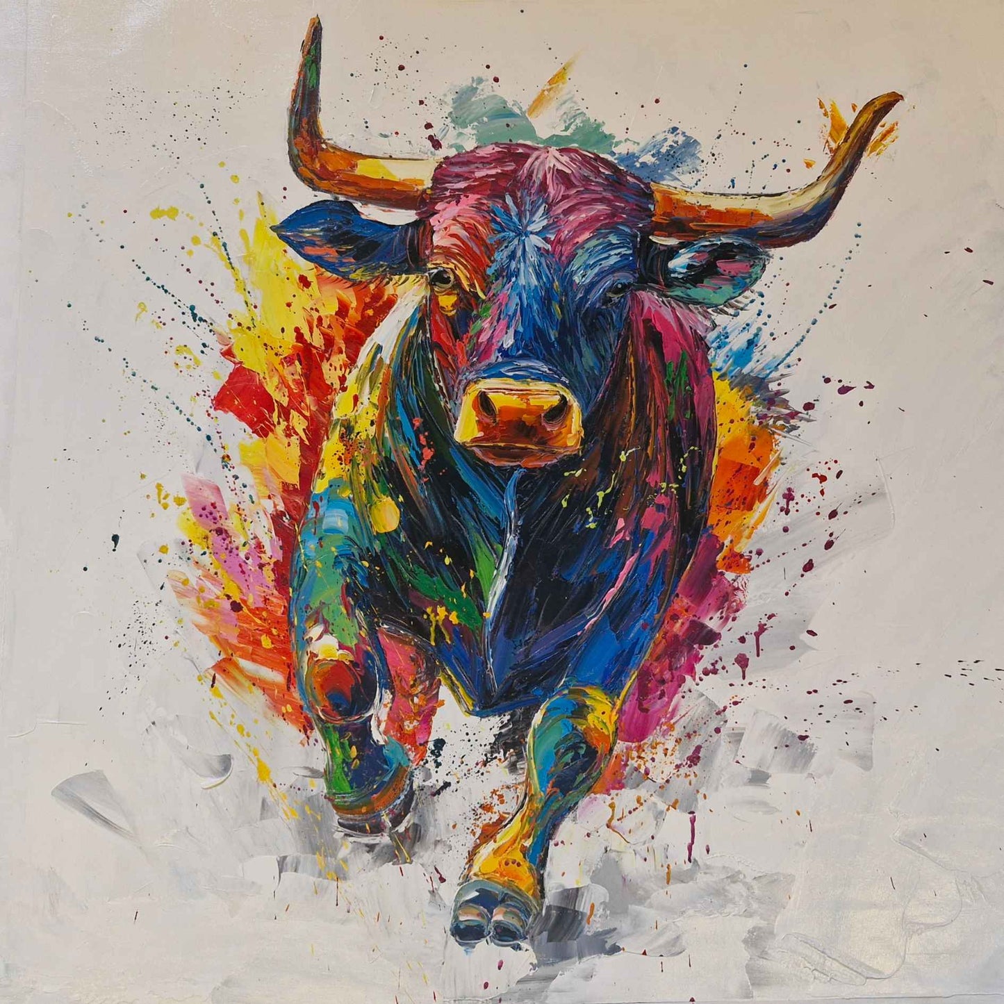 El toro, símbolo de poder, pasión y determinación, es el protagonista absoluto de esta composición. Su figura emerge del fondo blanco con pinceladas audaces y salpicaduras que generan una sensación de dinamismo. Cada trazo ha sido cuidadosamente aplicado por artistas expertos, dando como resultado una obra 100% artesanal con acabado de galería.