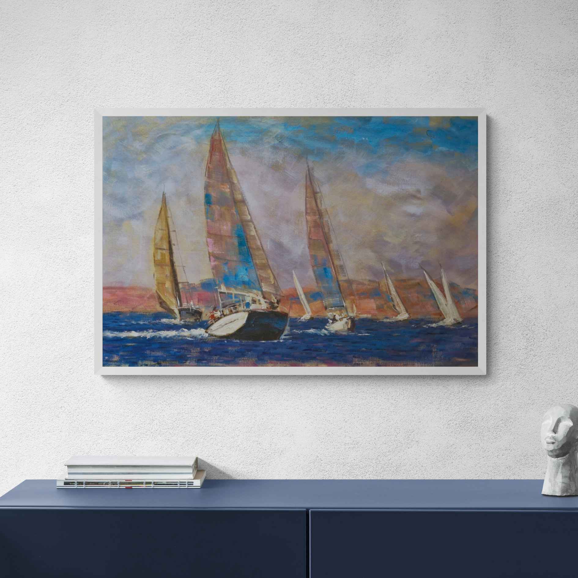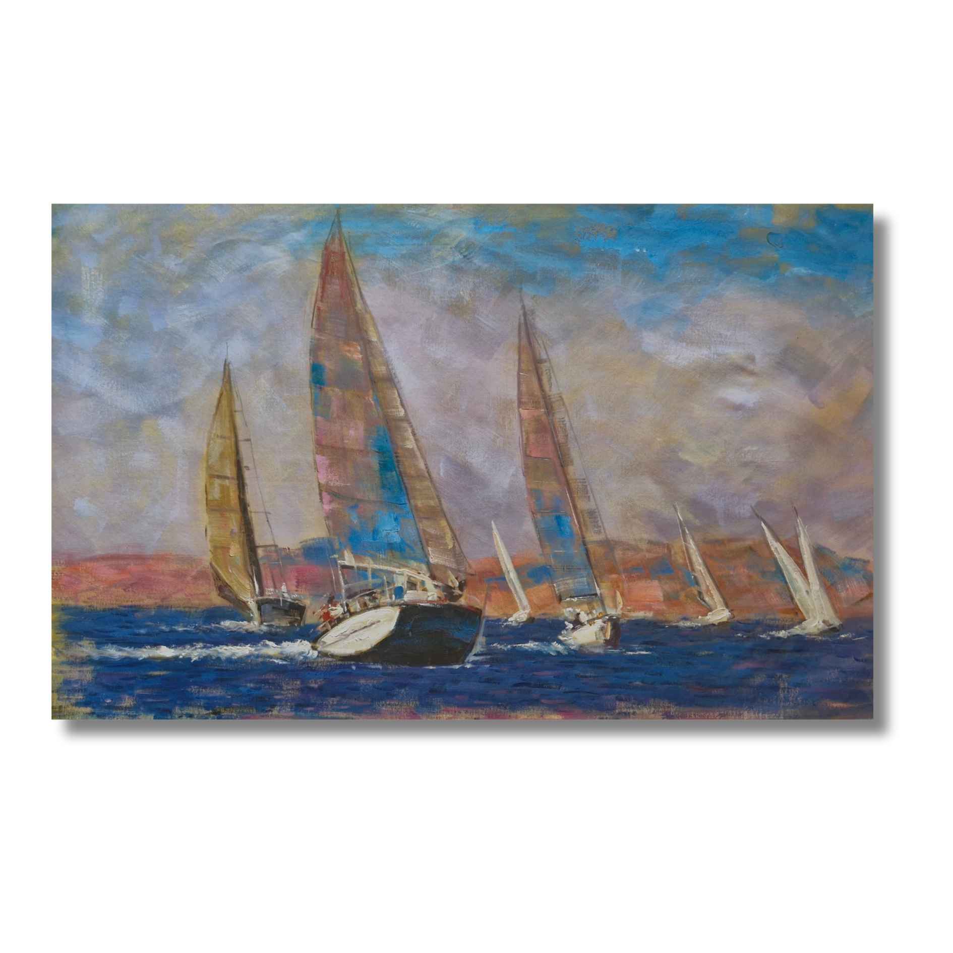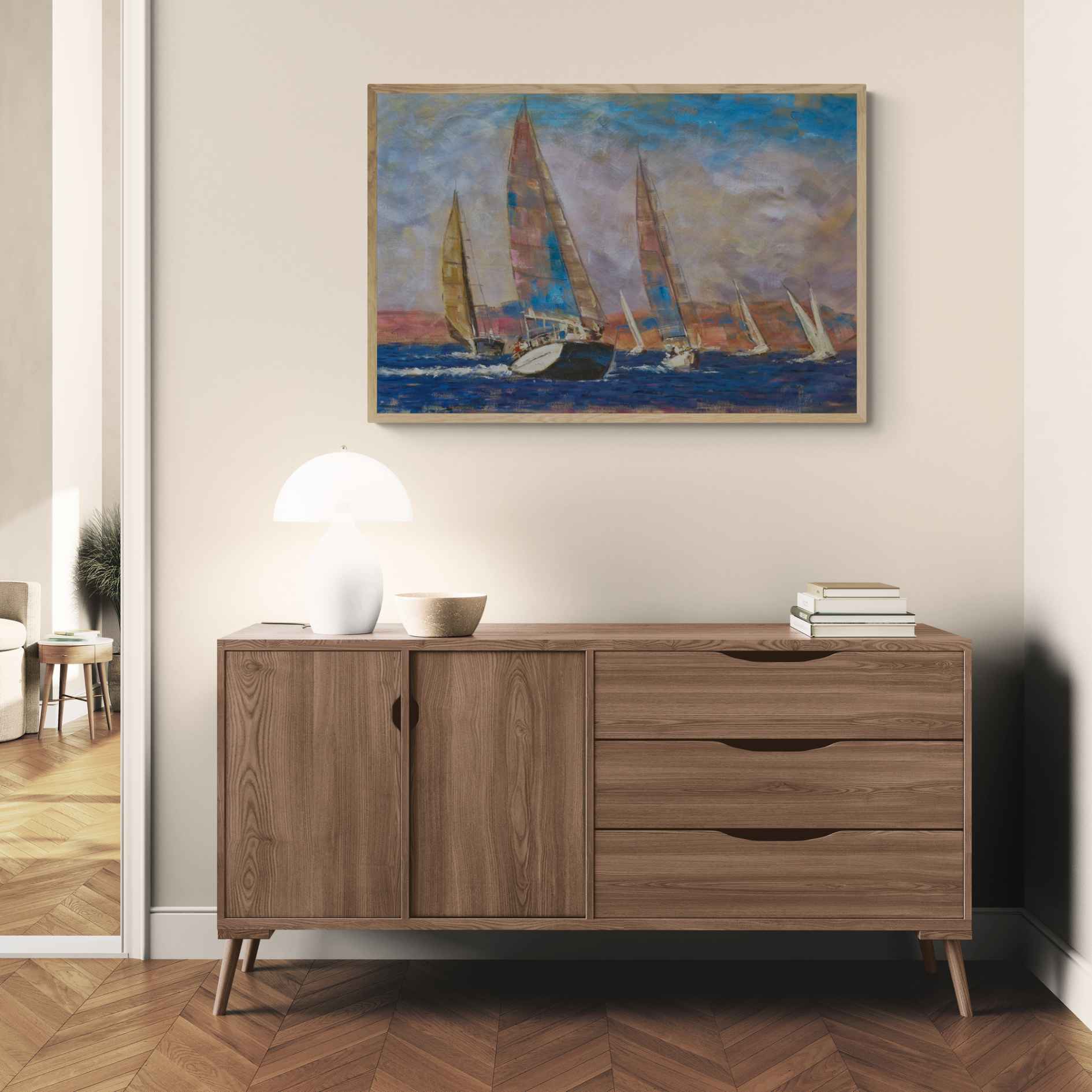 Cada pincelada refleja la pasión del artista por el mar y la navegación. Los veleros, estilizados con velas en tonos tierra y toques de azul, se funden con un fondo marino que mezcla cielo dinámico y horizonte cálido. Esta escena náutica aporta elegancia atemporal y serenidad visual, perfecta para salones, despachos o espacios de descanso.